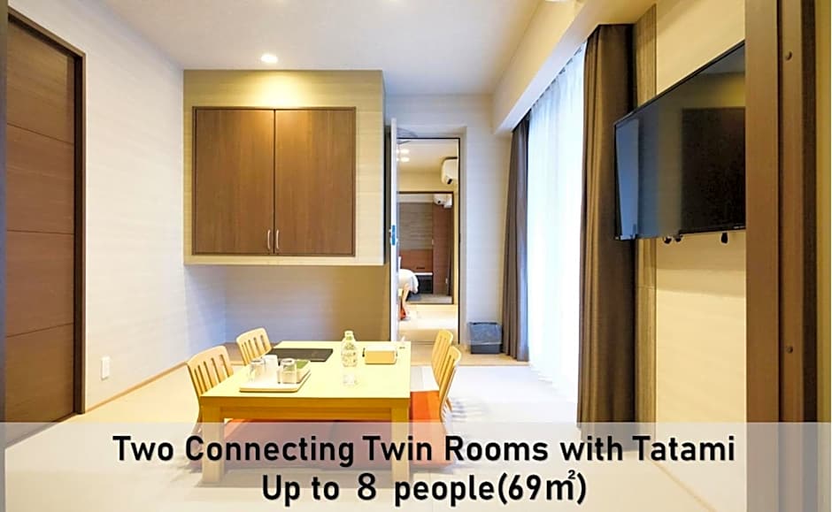 The spacious air-conditioned family room offers a flat-screen TV with satellite channels, tatami, soundproof walls and a dining area. The unit has 4 beds and 4 futons.